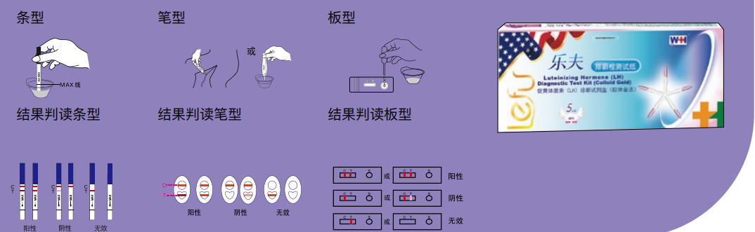 條型1. 將尿液收集在干凈、干燥的尿杯中;2. 撕開鋁箔袋,取出試紙條 ( 請勿觸摸到試紙中段白色部分 )。將試紙標有 MAX 箭頭的一端浸入尿液中。注意不要使尿液超過箭頭所指的橫線,保持 15 秒鐘后取出平放;3. 5-10 分鐘內觀察結果,最長不超過 10 分鐘。板型1. 收集尿液在干凈的尿杯中;2. 撕開鋁箔袋,取出檢測板和塑料吸管,并檢查試紙是否完好無損;3. 用塑料吸管將 3-4 滴尿液樣本滴入加樣孔 (S) 中;4. 5-10 分鐘觀察結果,最長不超過 10 分鐘。筆型1. 收集尿液在干凈的尿杯中;2. 拔下蓋子直接淋尿或從尿杯中吸取尿液至吸水棒全部濕透;3. 蓋上蓋子,窗口向上平放,5-10 分鐘內觀察結果,最長不超過 10 分鐘。