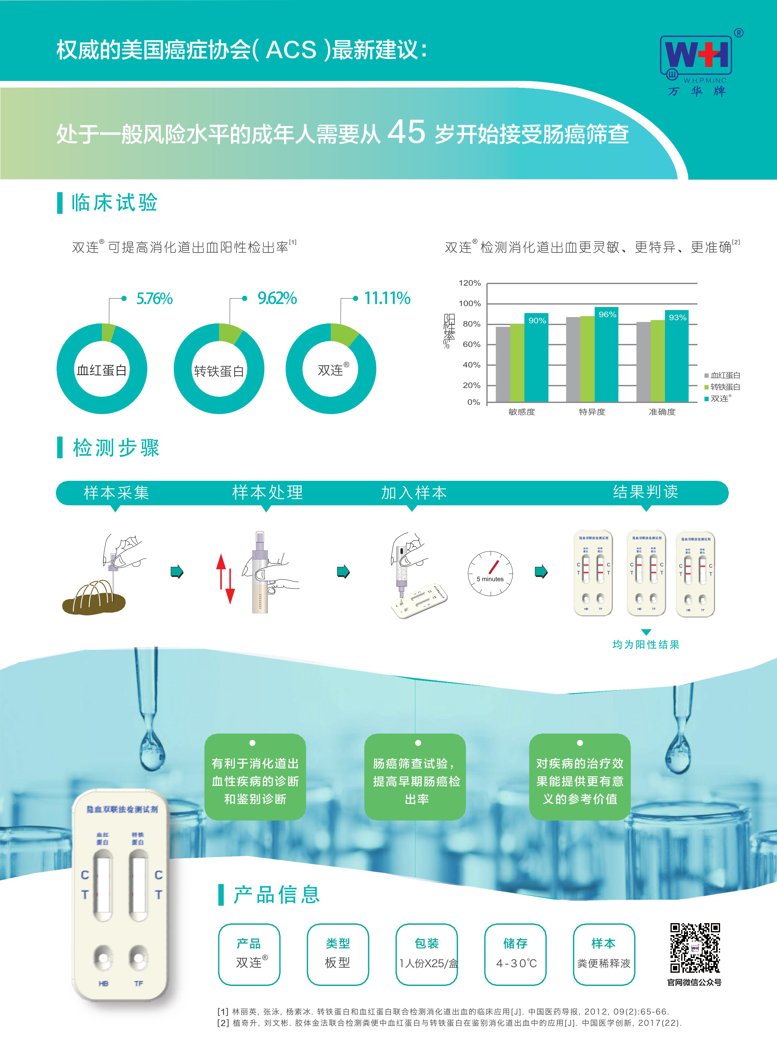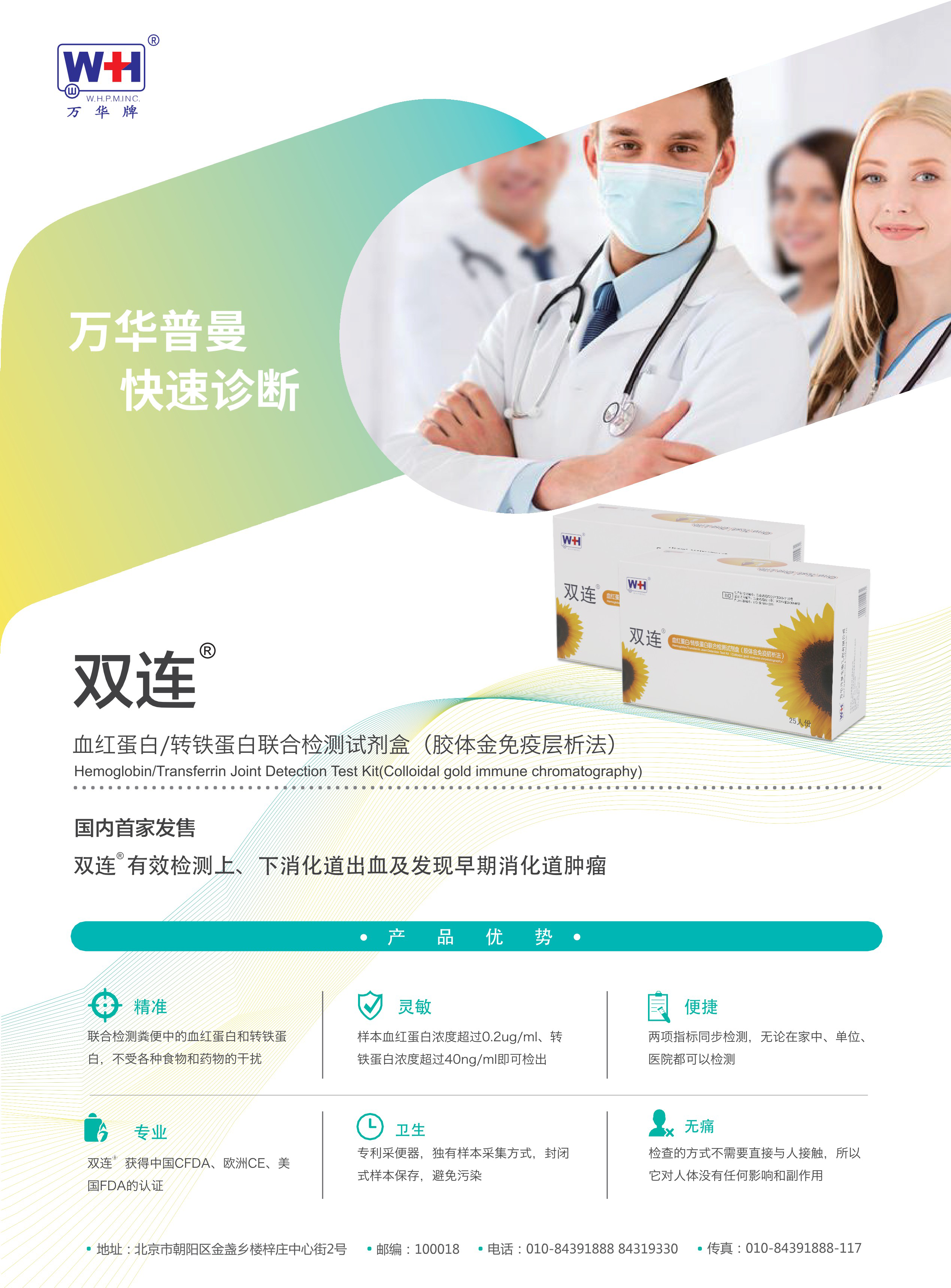 精準:聯合檢測糞便中的血紅蛋白和轉鐵蛋白,不受各種食物和藥物的干擾。便捷:兩項指標同步檢測,無論在家中、單位、醫院都可以檢測。專業:雙連 ? 獲得中國 CFDA、歐洲 CE 認證,美國 FDA的認證。靈敏:樣本血紅蛋白濃度超過 0.2ug/ml、轉鐵蛋白濃度超過 40ng/ml 即可檢出衛生:專利采便器,獨有樣本采集方式,封閉式樣本保存,避免污染。 無痛:檢查的方式不需要直接與人接觸,所以它對人體沒有任何影響和副作用。