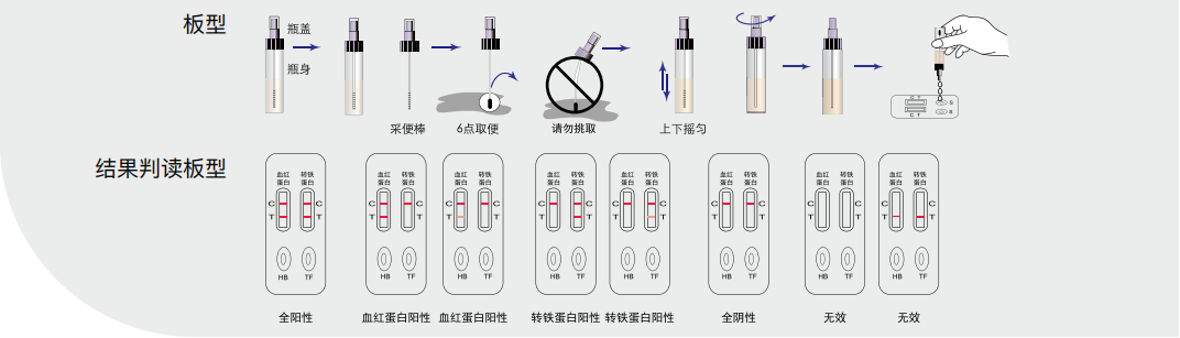 本品采用雙抗體夾心法研制,用于體外定性檢測人糞便樣本中的血紅蛋白和轉鐵蛋白的含量。健康者每日胃腸道生理性失血量為 0.6ml,大于 2ml 既屬于病理性出血。血液中的血紅蛋白和轉鐵蛋白的比值為 51.2:1,而糞便中血紅蛋白和轉鐵蛋白的比值為 5.4:1,大約有 40-50% 的上消化道出血患者不能由血紅蛋白免疫法檢出,原因是:①血紅蛋白或紅細胞經過消化酶降解或消化殆盡,已經不具有原來的活性;②過量血紅蛋白導致反應體系中抗原過剩出現前滯現象;③患者血紅蛋白的抗原與單克隆抗體不匹配。轉鐵蛋白是一種 β1 球蛋白,存在于血漿中,當消化道出血時,血漿中轉鐵蛋白會漏入到胃腸道,并隨糞便排出體外。轉鐵蛋白在消化道中較血紅蛋白穩定。在檢測血紅蛋白的同時,檢測轉鐵蛋白,就能大大減少假陰性反應的出現,提高陽性檢出率。